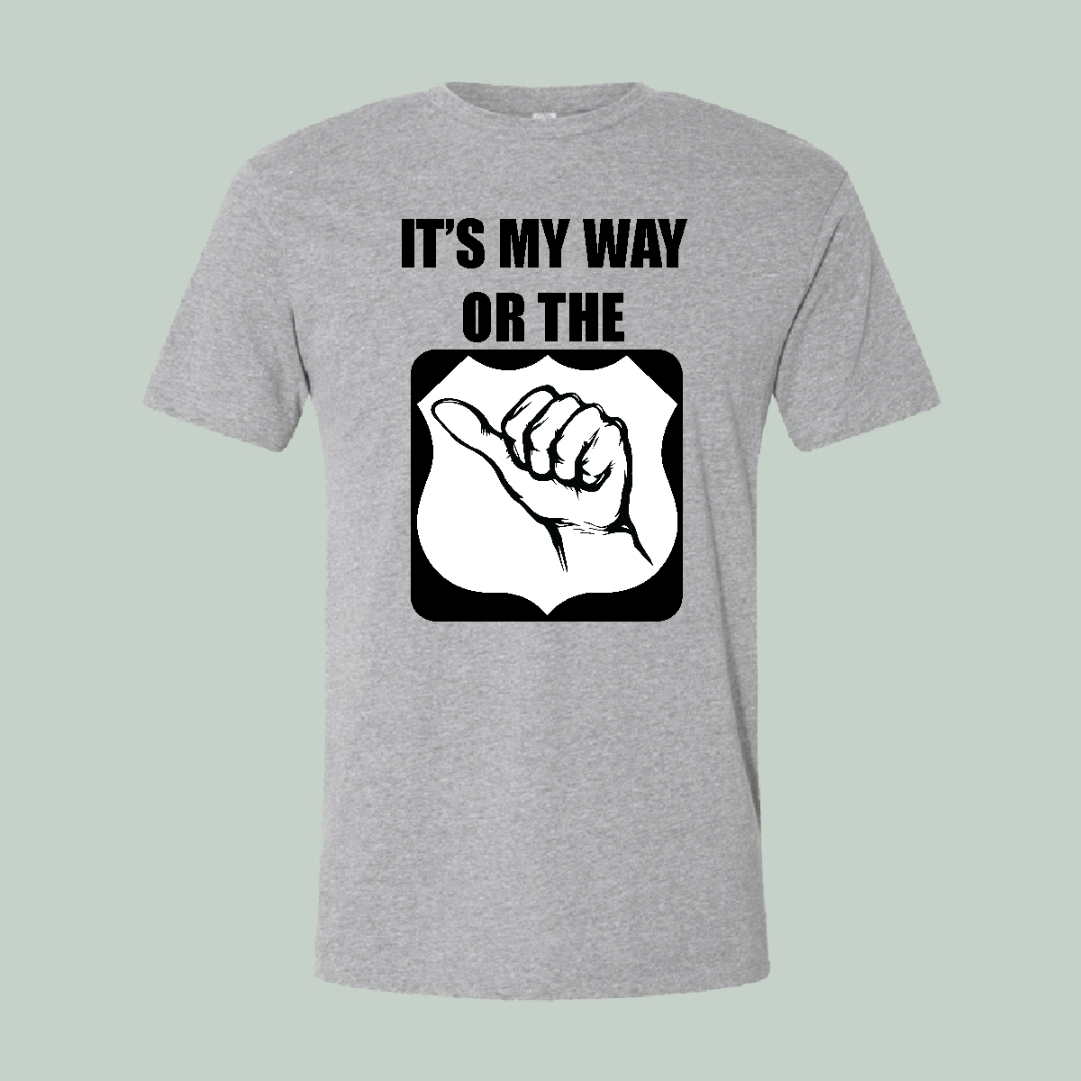 Catch attention with this fun and quarky shirt. Its an old saying "My Way or The Highway", and a great way to break the seriousness in the room. Try this funny shirt out and if they dont like it, then they can hit the highway.