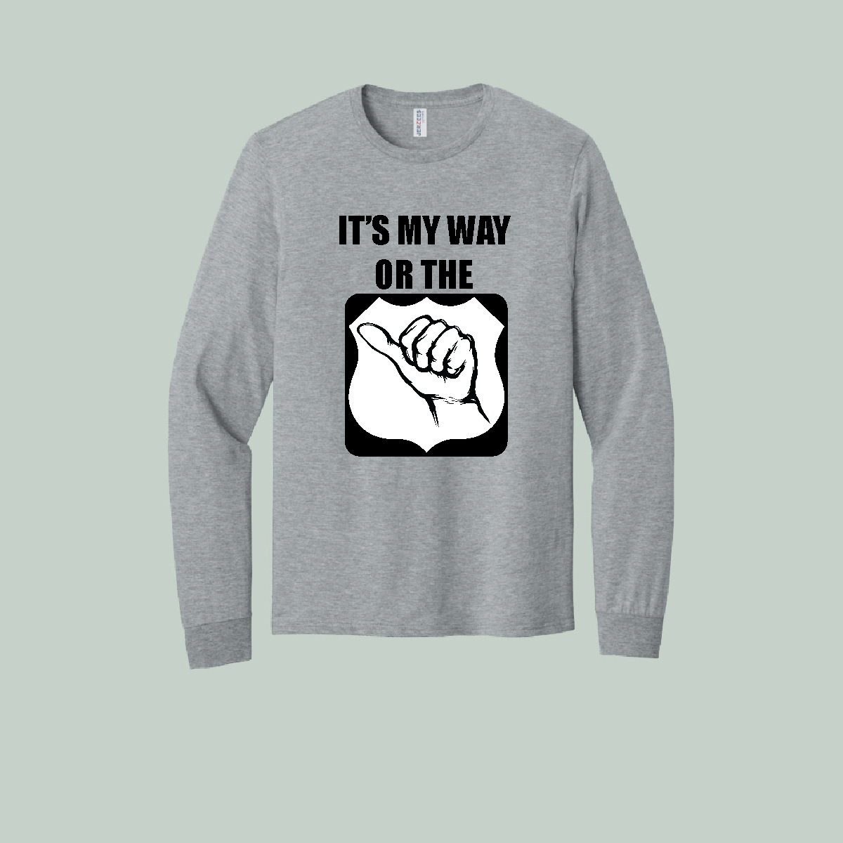 Catch attention with this fun and quarky shirt. Its an old saying "My Way or The Highway", and a great way to break the seriousness in the room. Try this funny shirt out and if they dont like it, then they can hit the highway.